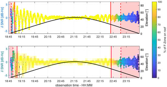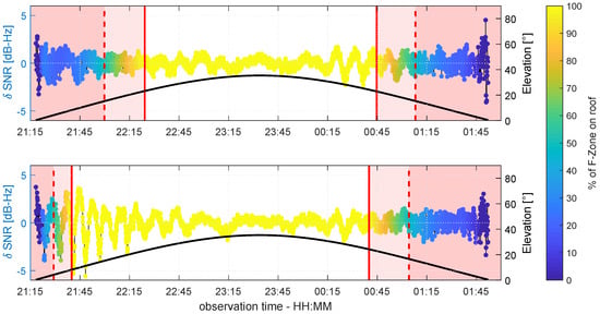In Figure 18, the -SNR time series of G14 is shown for antennas A and B. The values are color coded according to the percentage of overlap between the Fresnel zone and the roof. Between the solid red lines, both, the Fresnel zones and the reflection points are completely located on the roof (). The pink shaded areas bounded by the solid and dashed red lines represent the transition phases, where the reflection point and only parts of the Fresnel zones are located on the roof (). In the red shaded areas (left and right of the dashed red lines), the reflection point is not located on the roof and .