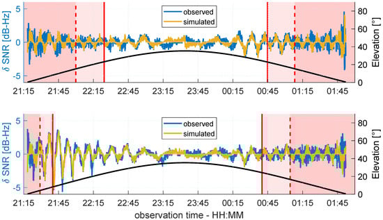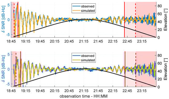 In order to better assess the accordance between the real observations and the theory on multipath propagation, the SNR values for both antennas were simulated following Equation (4) under the assumption of a horizontal reflector. Therefore, the multipath relative phase was determined by Equation (6), and the attenuation factor was derived from the raw SNR time series of G14 and G19 in units of dB-Hz, respectively, following the procedure described in Section 2.2. Finally, the trend of the simulated time series, which was modeled by a polynomial fit, was subtracted to determine the simulated -SNR time series. Since the spatial limitation of the reflector plane was not taken into account during the simulation, from a certain point onwards, the simulated and observed -SNR values were expected differ from each other. In Figure 20 and Figure 21, the observed and simulated -SNR time series of G14 and G19 are shown, respectively. For reasons of clarity, in both figures, the values are not color coded, but the percentage of overlap between the Fresnel zones and the roof is again grouped into the three phases: (1) , (2) , and (3) .