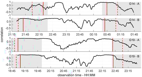 Correlation of simulated and observed -SNR time series for satellites G14 (top two panels) and G19 (bottom two panels). The grey shaded region represents the part of the observation duration where the Rayleigh criterion is fulfilled.
