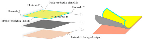 The tactile sensor is a “sandwich” structure with three layers, labeled by L1–L3, respectively, as shown in Figure 1. L1 is the conductive plane designed according to a special structure. It is composed of the strong conductive line, M1, and a weak conductive plane, M2. M1 is coated around M2, and the conductivity of M1 is much higher than that of M2. There are four electrodes fitted at four corners of M1. When a bias excitation is applied to its two diagonal electrodes, a uniform electric field will be generated on the weak conductive plane. L2 is the force sensing element, that is, the piezoresistive film. Its internal resistance decreases with the increase of external pressure. L3 is the conductive plane with good conductivity, and the whole layer of L3 is used as signal output and is referred to as electrode E. There is a seamless fit between L2 and L3, and a small amount of gas is filled and sealed between L1 and L2. When the electronic skin is not stressed, there is no contact between L1 and L2.