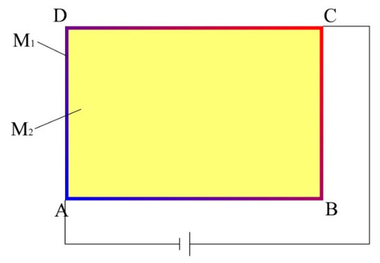 As shown in Figure 2, a bias voltage is applied to the two diagonal points A and C of M1, and since the conductivity of M1 is much greater than that of M2, most of the current will flow from C to A in M1. A potential distribution of the linear increase will be generated from A to C in M1. Since M1 has good contact with M2, the potential distribution of the linear increase will also be generated from A to C on the boundary of M2, that is the boundary potential distribution necessitated by constructing a uniform electric field.