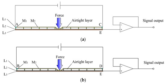 The potential of any point in M2 of L1 can be detected as shown in Figure 5. Firstly, a constant DC bias voltage is applied to the two diagonal points A and C in M1 of L1, and a uniform electric field will be generated in M2 of L1. If an external force is applied to the surface of the sensor, L1 will deform, pass through the airtight layer and contact L2 and L3 at the contact point. Next, the potential of the whole layer of L3 will be equal to the potential of the contact point in M2 of L1. L3 is connected to an operational amplifier with infinite input impedance so that it is able to output the potential of the contact point. Similarly, if a constant DC bias voltage is applied to the two diagonal points B and D in M2 of L1, the potential of the contact point can also be obtained from L3. According to the linear relationship between the position and the potential in the uniform electric field, the X and Y coordinates of any contact point in M2 of L1 can be easily calculated. Thus, the detection of the contact position can be realized.