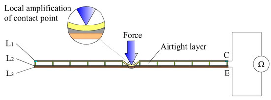 The principle functioning of contact force detection of the sensor is based on the piezoresistive effect of the force sensing element. The whole layer of L2 is made of piezoresistive film and used as the force sensing element of the sensor. As shown in Figure 6, when an external force is applied to the surface of the sensor, L2 is pressed by L1 and L3 at the contact point. The resistance between L1 and L3 of the sensor will then decrease with the increase of the external force. Therefore, the contact force can be detected by extracting the resistance between electrode C and electrode E of the sensor.