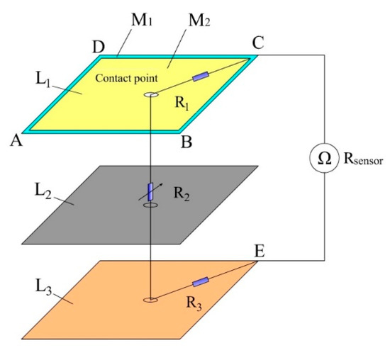 where is the resistance between the contact point in M2 of L1 and electrode C, which is related to the position of the contact point. is the resistance between L1 and L3 at the contact point. Ignoring the contact resistance, can be regarded as the resistance of the piezoresistive film at the contact point, which decreases with the increase of the external force. is the resistance between the contact point in L3 and electrode E. Since L3 has good conductivity, is very small and negligible.