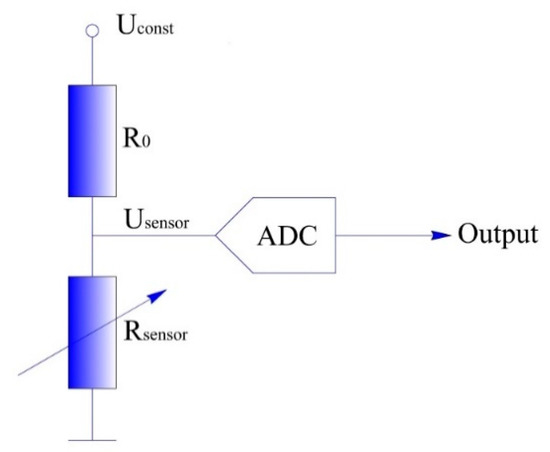 The detecting circuit of the contact force can be realized by a simple resistor divider circuit, as shown in Figure 8. The sensor (represented as in Figure 8) is connected in series with the fixed resistance , and a constant voltage is applied at both ends of the circuit; then the output voltage is: