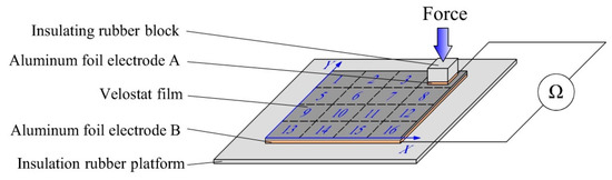A simple test device was designed to test the consistency of the piezoresistive properties of the Velostat film. The test device is shown as Figure 11. First, a piece of the Velostat film with 100 × 100 mm dimensions was divided into sixteen small squares of 25 × 25 mm size, and two pieces of aluminum foil were used as electrodes to clamp the Velostat film. Then, a force of 1–15 N was applied to them, respectively, and the resistances between the two electrodes were recorded by a multimeter. Two rubber blocks were used to insulate the aluminum foils from the outside. The size of the aluminum foil electrode A was 15 × 15 mm, and the size of the aluminum foil electrode B was 100 × 100 mm. The mapping relationship between the force and resistance of the sixteen small squares of the Velostat film is shown in Figure 12.