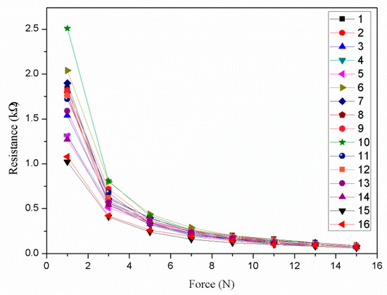 As shown in Figure 12, there are sixteen piezoresistive properties curves, which are obviously different. Therefore, the piezoresistive properties of the sixteen small squares of the Velostat film are inconsistent. The main reasons for the differences are that the distribution of conductive particles in the interior of the Velostat film is uneven and the contact resistance between the Velostat and aluminum foil of different small squares are different.
