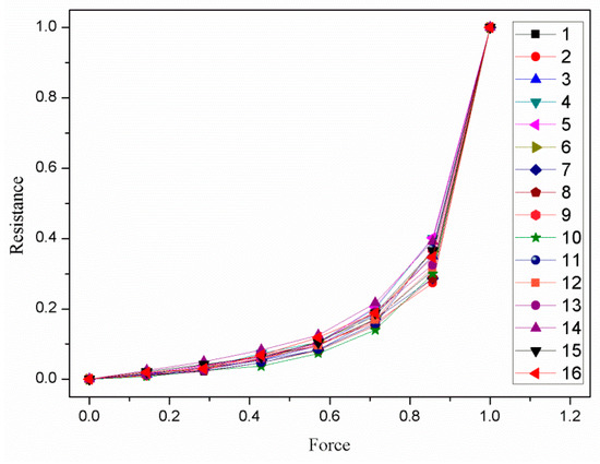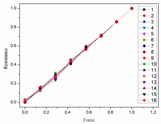 Comparing Figure 14 and Figure 15, the relationship between the resistance and the force were linearized effectively, and the consistency of the piezoresistive properties curves of the sixteen small squares was improved. The maximum nonlinear error was reduced from 58.3% to 4.5%. The maximum relative standard deviation was reduced from 29.1% to 8.6%. It is worth noting that the consistency of the piezoresistive properties curves can be further improved by reducing the mean square error.