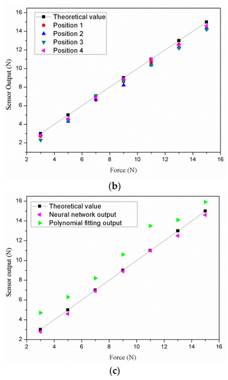 In addition, by the means of the polynomial curve fit, the average of the sixteen piezoresistive properties curves (shown in Figure 12) was used to calibrate the sensor for detecting the contact force. The fourth position (shown in Figure 17a) of the tactile sensor was tested by the two algorithms. The sensor outputs were shown in Figure 18c.