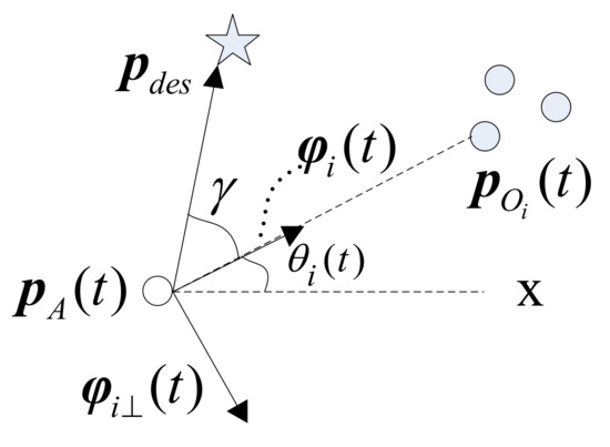 As shown in Figure 1, denotes the relative angle of two lines: one of which crosses through the agent and the obstacle; another crosses through the agent and the destination. Obviously, is equal to Equation (11). Theorem 1 implies that the collision will be inevitable if under condition Equations (10) and (11). In other words, we should make non-zero in the case of , which can be implemented through introducing an angle-dependent factor to Equation (12),
