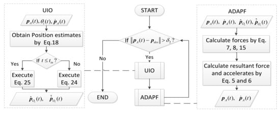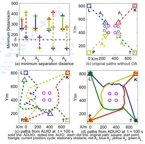 Here, we compared between the combination of angle-dependent APF with UIO (ADUIO) and APF with UIO (AUIO). As shown in Figure 7a, minimum separation distances between each agent to other three moving agents by ADUIO are all above , while their AUIO counterparts are below . It is implied that paths generated by AUIO fail to avoid collision threats but succeed by ADUIO. As shown in Figure 2c,d, both methods avoid stationary obstacles successfully but cost different length of time to reach destinations. As shown in Table 2, the terminative time of ADUIO is much smaller than AUIO. In other words, our proposed scheme reaches the destination more quickly, while AUIO produces significant improper roundabout movements, as shown in Figure 7c, due to APF forces caused by CC obs. Results in Figure 7a,d also suggest our UIO guarantees estimation accuracy for the requirement of OA.