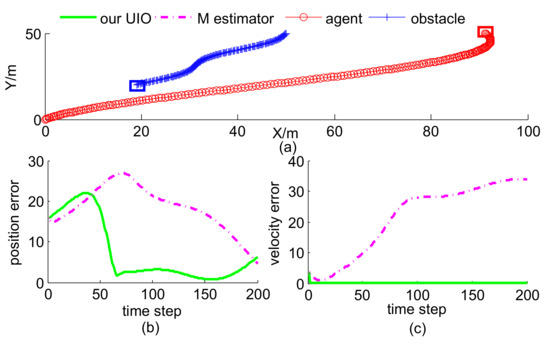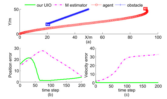 In this scenario, the agent’s trajectory was given, and the obstacle motion contained two cases. Case 1 is curve-maneuver with velocity and Case 2 is constant-velocity with velocity . The initial position of the obstacle was , whose corresponding estimate was . There is no existing method to solve the same problem as our UIO estimator, so we take M estimator [25] as the rival, which has a similar form as our UIO estimator. It is worth mentioning that M estimator does not obtain velocity estimate, thus we computed the differential of position estimate as its velocity estimate. As shown in Figure 4 and Figure 5, our proposed UIO estimator is much better than M estimator in estimating the position and velocity of the obstacle. Blue and red squares represent terminate positions of obstacle and agent, respectively.