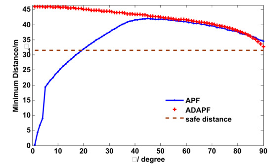 As shown in Figure 6, the APF fails to guarantee that the MD is always larger than the minimum safety distance 31.5 m, while our path planner is reliable for all . Especially in the situation of and , the agent using APF inevitably collides with the obstacle because the MD is zero.