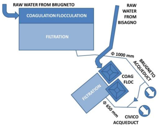 At the site where the plant is located raw water from two different supplying sources are treated: from the Brugneto artificial basin (25 Mm3.) supplying the homonymous aqueducts and from the water intake on the stream Bisagno supplying the Civico Acqueducts (Figure 3).