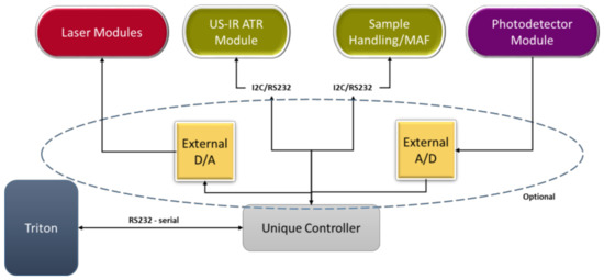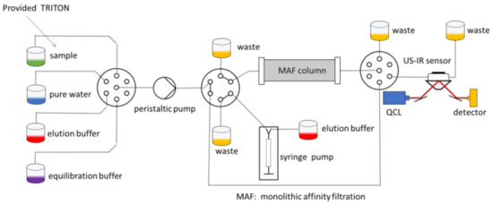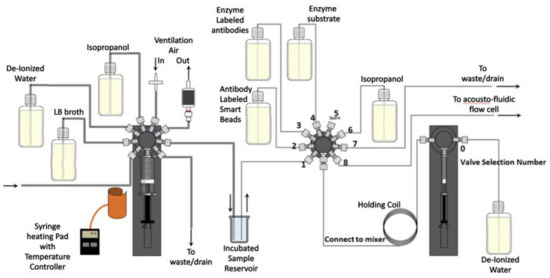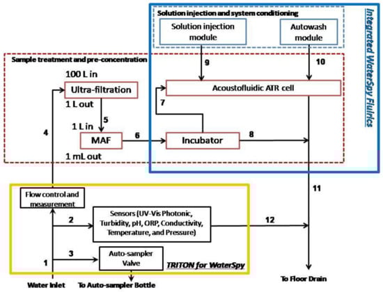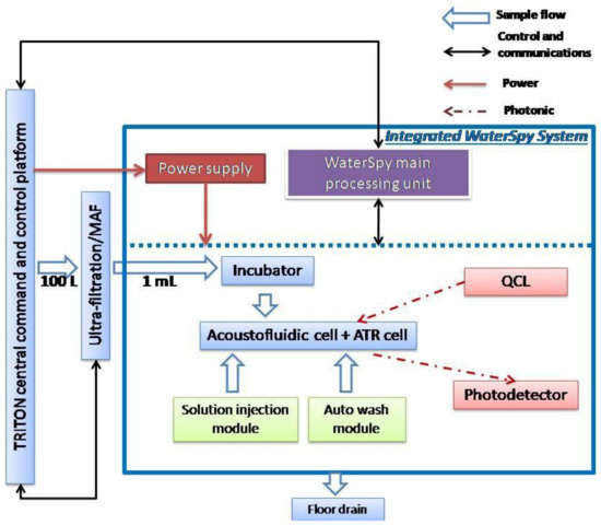 An overall design of the system and its interactions can be viewed in Figure 5. As was mentioned earlier, the commercial water quality monitoring platform TRITON by AUG (Athens, Greece) is used to provide initial sample to the WaterSpy sampling treatment and pre-concentration system. The sample then is reduced down to 1 mL using the Ultra-filtration/MAF and is then fed in the Incubator that multiplies the bacterial population. After an incubation period of 4–6 h the incubated sample is redirected in an Acoustofluidic ATR cell, with “smart bead” carrying antibodies to retain the bacteria. After this process, enzyme-labelled antibodies are pumped in to interact with the retained bacteria to form an enzyme-labelled bacteria-bead conglomerate. Additionally, a substrate is injected in order to be converted to a specific product via the immobilized enzyme. Finally, the enzyme product is loaded and measured using the QCL and photodetectors. The integrated fluidic system can be viewed in Figure 6.