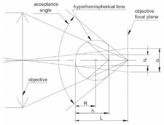A dedicated IR detector will be optimized for the needs of WaterSpy, and will be then integrated in a detection module consisting of: photodetector, preamplifier and TEC controller. The GaAs hyperhemispherical lens covering the active area will look as depicted in Figure 8, where d’ is the active detector size, d is the apparent detector size, R is the lens radius, h is the lens height. The acceptance angle of the hyperhemisphere made of GaAs is about 35°, although to some extent the manipulation of the field of view is also possible. The default package for the photodetector is the TO8 can.