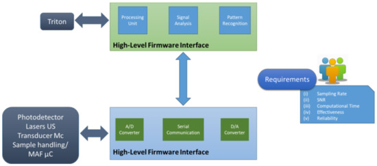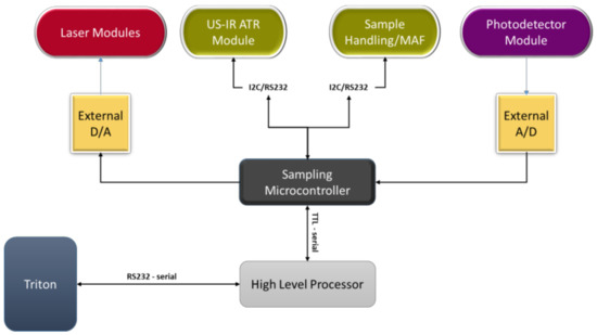 Signal processing is done by the higher-level processor, which can be either a single-board computer or a compact controller. All signal processing algorithms will run on this processor. The high-level processor is also responsible for the communication with the TRITON. It is connected to the sampling microcontroller through a serial port.