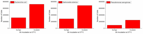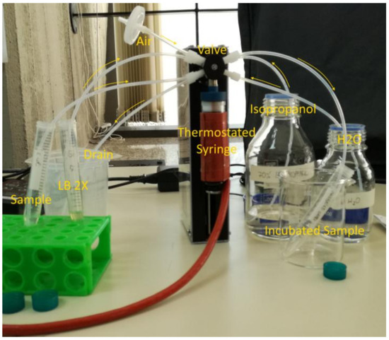 In this section, we present some preliminary experimental results of the WaterSpy device components. In particular, we performed tests on the techniques that are incorporated in the device to test the bacteria incubation, a critical step in increasing the number of bacteria present in the sample to be identified by the QCL-photodetector. The thermostated syringe was tested and the amount of bacterial cells generated was compared with the product of a growth performed in a bacteriological incubator under the same conditions of temperature (37 °C) and time (6 h). Both bacterial growths (syringe and incubator) were performed without shaking. The thermostated syringe configuration is presented in Figure 14.