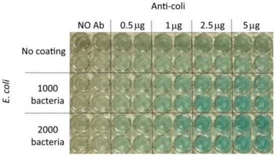 Despite very little a-specific binding of anti-E. coli, that can be observed by the very small increase of the absorbance in the no coated wells in the presence of increasing amount of antibody, this ELISA test indicates that it can detect the presence of a low number of bacteria. In particular, by using 5 μg of antibodies about 2.5-fold and 3-fold of the no-coating absorbance intensity were measured for 1000 and 2000 bacteria, respectively. These relative values were observed at all the times measured. The biggest absorbance absolute values both for 1000 and 2000 bacteria was observed after 120’, anyway after 60’ the absorbance stopped to increase significantly.