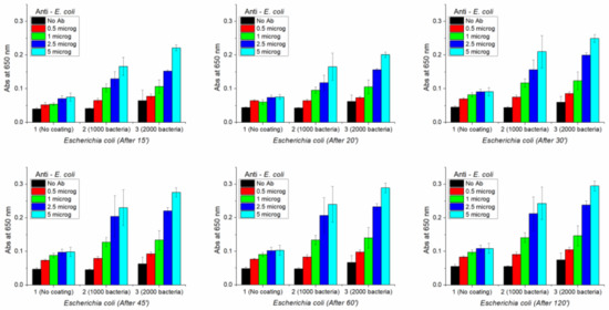 In order to check if the same ELISA assay can detect the presence of a very low number of bacteria, 1000 and 2000 E. coli cells were used to coat the bottom of the wells. In this experiment (Figure 17), different amounts of anti-E. coli were tested: 0.5, 1, 2.5 and 5 μg. After adding TMB, the absorbance was measured at 650 nm, without stopping the reaction with HCl. Each antibody/bacteria combination was repeated in four wells, and mean values and standard deviations were calculated. Absorbance was measured after 15′, 20′, 30′, 45′, 60′ and 120′. The results are reported below in Figure 18.