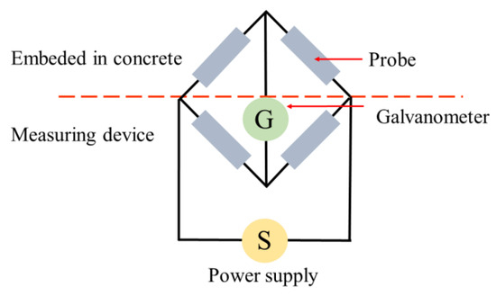 In this technique, ERPs (of the same material–steel) are physically and electrically attached to CSB before concrete casting, and consist of four electrical resistances in a balanced bridge connection, as shown in Figure 2. Its resistance varies in inverse proportion to the cross-section area; therefore, changes in probe resistance can provide an indication to the thickness reduction by corrosion to achieve the test purpose. Furthermore, significant information about the corroded CSB of the cross-section reduction RCS, and the corroded layer thickness , can be obtained [27]: