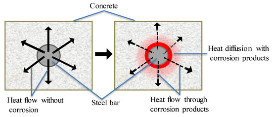 When an electromagnetic induction device is applied to heat CSB, there is smaller diffusion rate of heat from CSB to surrounding concrete, due to lower thermal conductivity of corrosion products in Figure 4. According to the different heat diffusion properties of CSB under various corrosion conditions, CSB subjected to induction heating can provide vital information about corrosion. The detection is easier with larger rebar diameter and smaller cover depths, because of faster heat diffusion and higher temperature increase on concrete surface. Kobayashi [67] obtained the infrared thermography images of temperature distributions on concrete surface under different corrosion loss using IT principle.