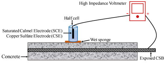 To conduct an HCP survey on RC structures with suspected corrosion is now a common practice, particularly due to chloride contamination. The potential of CSB might vary by corrosion, while that of the standard reference electrode is stable. Therefore, a change in potential can present a different corrosion status of CSB. Figure 6 shows the configuration of a half-cell system, which comprises of a metal rod soaked in a solution of the same metal anion (such as Ag/AgCl and Cu/CuSO4). A rod is electrically connected to CSB via a voltmeter. Sponge and surrounding concrete between half-cell and CSB are wet to ensure good electrical connection [105].