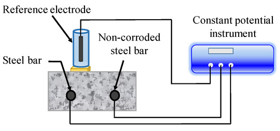 In LPR method, a small amount of equilibrium potential (10–30 mV) is applied between the reference electrode on concrete surface and CSB, as illustrated in Figure 8. The response current in a certain time is monitored, and the ratio of current to voltage amplitude is defined as the polarization resistance, Rp. Besides, there are several methods for Rp measurement, such as constant current method, dynamic potential method, and dynamic current method. Recently, a novel device of LPR, designed by Castillo et al. [126] for remote measurements of CSB corrosion, has a lower percentage of error compared to the equipment designed for commercial use.