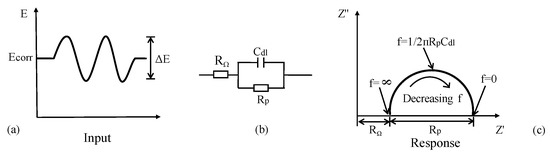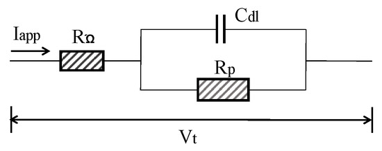 In general, concrete system can be electrically characterized using Randles model circuit as depicted in Figure 9. Cdl is the double layer capacitance of RC interface, RΩ is the concrete resistance between the reference electrode and CSB. The estimation of corrosion current is based on the Stern–Geary formula: