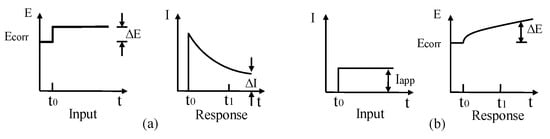 where are the Tafel constants of anode and cathode respectively, which can be determined by using Tafel diagram. B is the Stern–Geary constant, and its value is normally assumed to be 25 mV and 50 mV for active and passivity corrosion, respectively. From Faraday’s law, the corrosion current can be converted to the loss of CSB using Equation (3).