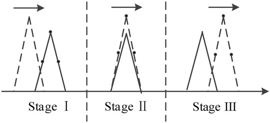 In most cases, the counterfeit signals generated by a satellite signal simulator are not overlapped effectively with the authentic signals present in the space in which the receiver is located. If the counterfeit signal and the authentic signal correspond to the same satellite, and the code phase difference between them is less than chips, then the overlapping of the two signals is considered to be effective in this paper, where is the spacing between early and prompt correlators (or the spacing between prompt and late correlators) of the code loop. The autocorrelation and cross-correlation properties of C/A codes mean that the counterfeit signal is equivalent to the noise for the receiver channel which locks the authentic signal, i.e., it is difficult for the simplistic spoofing to affect the positioning results of the tracking receiver. By contrast, the spoofing executed by the repeater can affect the positioning results of the target receiver without reacquisition. As shown in Figure 1, the repeater consists of two modules, namely the receiver module and the spoofer module. The receiver module is the same with an ordinary GPS receiver. The spoofer module properly delays and amplifies the received authentic signals and rebroadcasts the resulting counterfeit signals toward the target receiver. In order to ensure that counterfeit signals are effectively overlapped with the authentic signals, the repeater needs to know the approximate location of the target receiver to determine the appropriate time delay. Since the size of the repeater is usually small, it can be inconspicuously deployed near the target receiver, which facilitates the execution of spoofing [1]. Since it is easy for the simplistic spoofing to be handled, the spoofing mentioned subsequently in this paper is always executed by the repeater and has the form shown in Figure 2. The correlation peaks of the counterfeit signal and the authentic signal have successively gone through three stages: approaching, effective overlapping, and moving away. The amplitude of the counterfeit signal is higher than that of the authentic signal throughout the process. In fact, as long as is greater than 1.1, the target receiver will gradually lose its lock on the authentic signal [16]. is the power ratio of the counterfeit signal to the authentic signal.