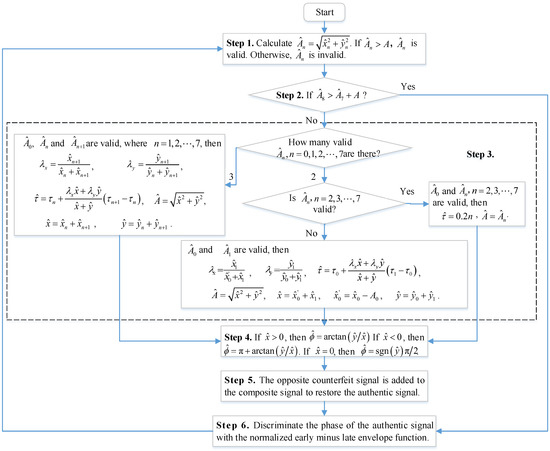 The time delays of the counterfeit signals for spoofing are usually not equal to those of the deployed multi-correlator. Detection and removal of counterfeit signals should be carried out according to the following steps.