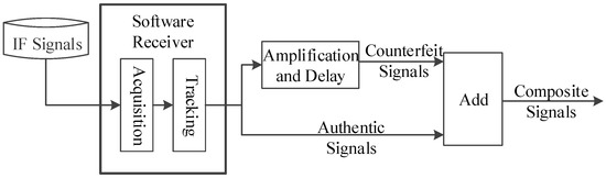 Since it is prohibited to broadcast spoofing signals in real world, the following method is devised to simulate an intentional attack, as shown in Figure 5. Firstly, a previously stored interval of authentic IF GPS signals with a sampling rate of 38.192 MHz is read. Secondly, these loaded signals are acquired and tracked by a software receiver, and the authentic signal from each satellite is amplified by 1.2 times such that the output is denoted as the counterfeit signal. Thirdly, time delay is applied to the counterfeit signal from each satellite. Lastly, we simulate the composite signals received by the target receiver by adding all original authentic signals and certain time-delayed counterfeit signals.