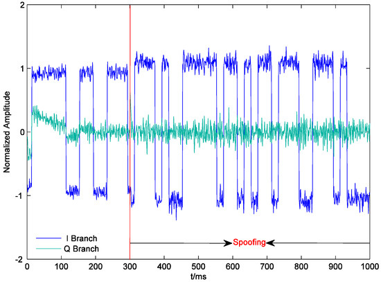 respectively, where is the known amplitude of the authentic signal, is the navigation data bit, is the CA code, is the number of counterfeit signals in the current channel, , and denote the noises in the I and Q branches, respectively. , , are the amplification coefficient of the amplitude, code delay (time delay) and carrier phase corresponding to the n-th signal, respectively. If , they correspond to the authentic signal and . Otherwise, they correspond to the counterfeit signals and . In reality, the repeater delays and amplifies the authentic signal, and then rebroadcasts it. This principle determines that there is usually only one counterfeit signal corresponding to each satellite, namely, . Although the counterfeit signals for spoofing can be ahead of the authentic signal, we assume by symmetry in order to facilitate the discussion.