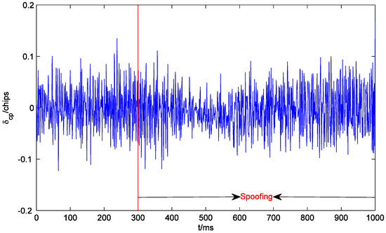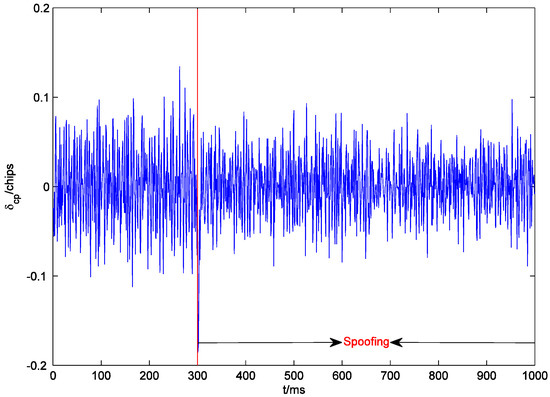 Figure 7 shows the outputs of the prompt correlators of PRN22 I and Q branches within 1000 ms. The receiver starts tracking at 0 ms. Since the initial tracking value obtained by the conventional acquisition method is not accurate enough, the carrier phase of the local signal gradually aligns with that of the authentic signal until about 180 ms. The output of the I prompt correlator is stabilized at around 1. After the spoofing is executed, the output of the quadrature prompt correlator suddenly changes, which indicates that the carrier phases of the counterfeit signal and the authentic signal are not the same. However, the counterfeit signal lags behind the authentic signal by only 0.6 chips. Their carrier frequencies are close, and the carrier phase difference between them is almost fixed. Therefore, the carrier phases of the local signal and the composite signal align rapidly, and the output of the quadrature prompt correlator is restored to near zero. At the same time, due to the large amplitude of the composite signal, the output of the I prompt correlator becomes larger. In addition, the noises of the prompt correlators of I and Q branches also become larger after the spoofing is executed, which indicates that spoofing signals might increase the noise level and deteriorate the precision of the estimated coordinates (similar to solar radio emission) [23]. As shown in Figure 8, at the beginning of spoofing, there is a significant jump in the output of the code phase discriminator of PRN22, which is confirmed by the results in Figure 7 and vice versa. The effective overlapping of the counterfeit signal and the authentic signal is equivalent to indirectly magnifying . Consequently, after the receiver locks the composite signal, the accuracy of the code phase discriminator is slightly improved.