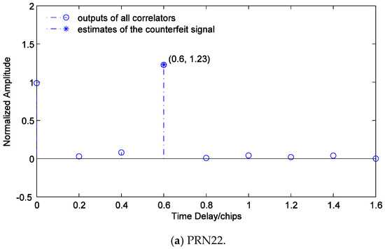 If only and are valid, then the estimated time delay of the counterfeit signal is equal to chips and the estimated amplitude is equal to , where . If only and are valid, then chips. Eliminating the effect of the authentic signal on the estimated amplitude of the first correlator in the I branch, we have from Equation (26)