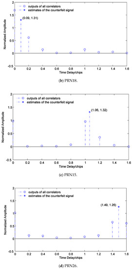 Figure 11 shows and of the counterfeit signal of PRN22. It can be seen that the carrier phase of the counterfeit signal is different from that of the authentic signal, which is consistent with the results in Figure 7 and Figure 8. If the effect of the data bit flipping is disregarded, the carrier phase of the counterfeit signal is approximately . Since the results of ML estimation at different instants are independent, and its effects at different instants are similar, the estimation results at a certain instant are visualized in order to demonstrate the effect of the multi-correlator structure and to verify the estimation method described conveniently in Section 4. Figure 12 shows all correlators’ outputs of I branches of PRN22, PRN18, PRN15, and PRN26, and corresponding estimated time delays and amplitudes of the counterfeit signals. It is observed that the estimates are consistent with the true values, which means the proposed multi-correlator structure is accurate in estimating the time delays and amplitudes of the counterfeit signals.
