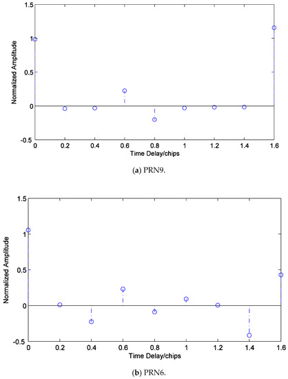 Figure 13 shows all correlators’ outputs of I branches of PRN9 and PRN6. Since the time delay of the counterfeit signal of PRN9 is close to 1.6 chips, the stimulating effect on the last correlator in subfigure (a) is significant. The receiver can easily determine that the counterfeit signal has a long delay and directly starts discriminating the phase of the authentic signal. Note that the sizes of and in subfigure (b) are close. However, if the time delay of the counterfeit signal is within the effective estimation interval of the multi-correlator structure from 0 to 1.6 chips, it is impossible that and of two adjacent correlators are close in size but are opposite in direction. Therefore, this can help the receiver to recognize the counterfeit signal with a long delay, and then perform phase discrimination directly on the authentic signal.