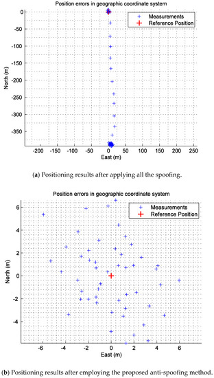 Figure 14 shows the positioning results after applying all the spoofing and the positioning results after employing the proposed anti-spoofing method in an east–north–up geographic coordinate system. The period of data update is 20 ms. In subfigure (a), the positioning of the target receiver is normal at 0-300 ms. Then, all the spoofing is executed at 300 ms. As a result, the positioning results of the target receiver gradually deviate from the real position and finally arrive at the steady state. In subfigure (b), the positioning of the target receiver remains stable and is not obviously affected by the spoofing, which consolidates the effectiveness of the proposed anti-spoofing method.