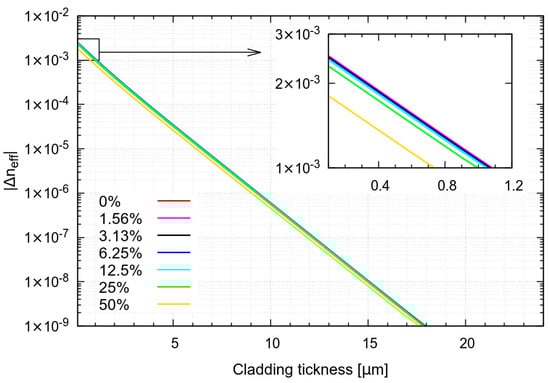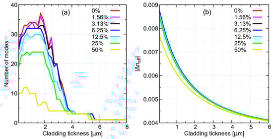 A three-layer structure does not permit calculating the modal content with an easy approximate formula, as with standard fiber. In particular, with standard fiber, which has a core surrounded by large cladding that can be approximated as infinite, it is possible to directly solve Maxwell equations, thus determining the cutoff condition and the number of guided modes. In a three-layer structure, obtained by reducing the cladding to a thin ring, the cladding modes are squeezed in the thin ring region. From the point of view of their effective index, which is numerically smaller than the refractive index of the cladding ring, these are cladding modes, but their intensity is spread significantly over the core. For this reason, to evaluate the number of modes, a criterion has been adopted based on the overlap integral, which is commonly used in complex microstructured fiber [,,,]. The overlap integral represents the normalized intensity that overlaps the core region, therefore it describes the fraction of mode intensity in the core. Here, a mode is considered to be a core mode when its overlap integral over the core area is larger than 0.5, so that the intensity of the mode is more confined in the core than outside the core. Using this criterion, it is possible to notice that the number of modes increases when the cladding thickness is reduced to less than 6 µm, reaching maximum discrimination around 2 µm, as show in Figure 2a. Furthermore, reducing cladding thickness improves the effective index distance (Δneff) between modes, showing a stronger dependence of the guiding properties of higher order modes on the solution refractive index. As an example, the Δneff between the FM and the first higher order mode (HOM) is shown in Figure 2b. It is possible to see that for small cladding thickness, Δneff is clearly dependent on the solution properties. In conclusion, the spectral broadening dependence on the refractive index of the solution appears to be driven by two cooperating effects: variation in core mode number and variation in effective index distance between HOMs.