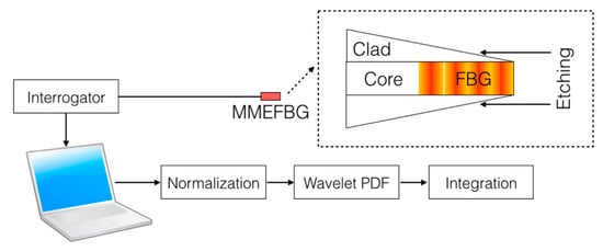 Schematic of the multimode etched fiber Bragg grating (MMEFBG) interrogation system and detection.