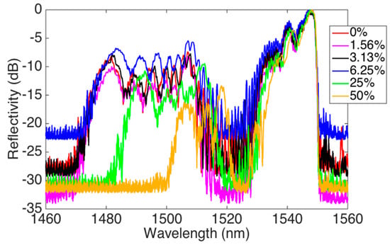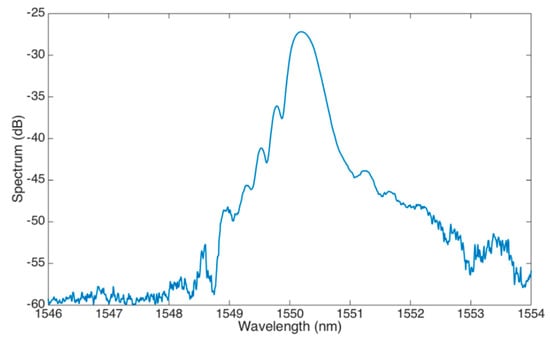 The MMEFBG is fabricated starting from a commercial FBG (Technica S.A. Atlanta, GA, USA), with 1550 nm central wavelength, 1 cm length, and 95% reflectivity, fabricated on a standard SMF-28 fiber. The reflection spectrum of the FBG before the etching is shown in Figure 4.