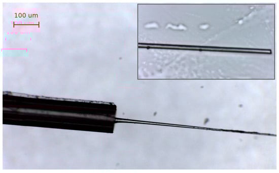 The fabrication and calibration for refractive index variations is performed as follows. The FBG is first cleaved on the tip side, to ensure that the etching process is enacted on the outer fiber surface. Then, the fiber is immersed in a hydrofluoric acid (HF, 48%; Sigma Aldrich) bath held at constant room temperature in a chemical fume hood (Secuflow, Waldner, ± 0.1 °C temperature stability) for 25 min. Then the outer coating is removed by dipping the fiber tip in acetone (99.8%; Sigma Aldrich) for about 1–3 min. The fiber is then inserted back into the HF solution for further etching. As in [], the etching process removes the outer cladding, progressively exposing the FBG. The etching process has a duration of 7–14 min; the spectrum progressively shows a shift toward shorter wavelengths, as observed in [,], and after 7 min multiple peaks appear. In this condition, the peak tracking routine of the si255 interrogator fails, as it cannot detect the correct number of peaks. After the EFBG has been fully etched, the fiber is extracted from the HF and rinsed in water for several minutes. The sensor after the fabrication procedure is shown in Figure 5.