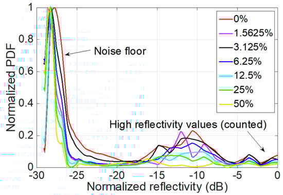 A simple method to process the information in Figure 7 and return a metric for refractive index sensing, as sketched in Figure 3, is to simply integrate all normalized PDF values for reflectivity higher than −20 dB.