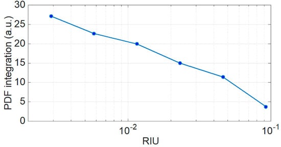 This final result is shown in Figure 8. For each refractive index change, the integration of the PDF (PDFint), as evaluated in Figure 7, shows a progressively decreasing function, varying from 29.3 for 0% sucrose (0 RIU) to 3.76 (0.09 RIU). This result, albeit obtained with an unconventional estimator, is in line with [] and Section 2; as the outer refractive index approaches the refractive index of the cladding, the contrast is diminished and the number of modes is reduced, thus generating a visible variation of the PDF integration. It is worth noting that the usual variation of wavelength used to evaluate the refractive index is substituted by the integration of PDF estimation. Here, the sensitivity unconventionally changes with the multimode behavior of the spectrum. From Figure 8, this fact appears evident by the log scale of the refractive index variation. As a first approximation, the best sensitivity is for small sucrose concentration, where we can find a sensitivity of 1100 PDFint/RIU. For higher concentrations of sucrose, the sensitivity reduces to 170 PDFint/RIU.