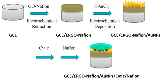 Step-by-step construction of a GCE/ERGO-Nafion/AuNPs/Cyt c/Nafion electrode.