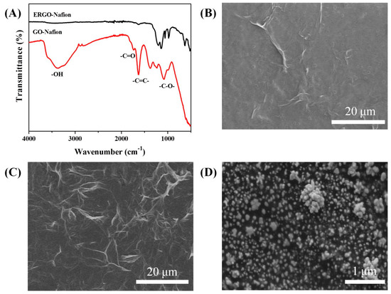 (A) FTIR spectra of GO-Nafion and ERGO-Nafion; SEM images of (B) GO-Nafion, (C) ERGO-Nafion, and (D) AuNPs on ERGO-Nafion.