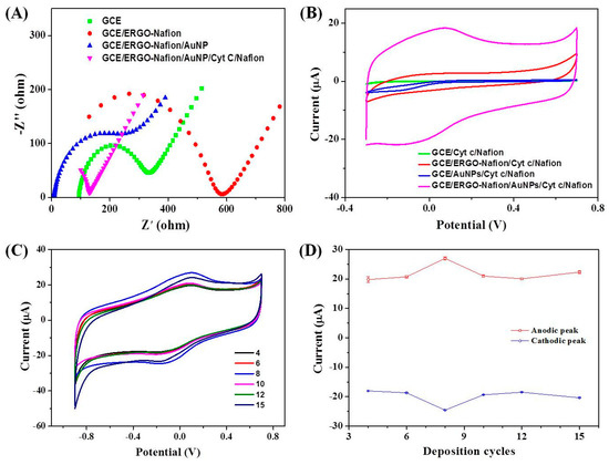 Step-by-step construction of an GCE/ERGO-Nafion/AuNPs/Cyt c/Nafion electrode (A) Nyquist plot of the EIS spectra of different electrodes in a 10 mM KCl aqueous solution containing 10 mM Fe(CN)63−/4−(1:1). (B) CV curves of different electrodes in a 0.2 M PBS solution (pH = 7) at a scan rate of 50 mV/s. (C) CV curves of the GCE/ERGO-Nafion/AuNPs/Cyt c/Nafion electrode in a 0.2 M PBS solution (pH = 7) at a scan rate of 50 mV/s with AuNPs deposited by varied cycles. (D) Plots of the peak current of the GCE/ERGO-Nafion/AuNPs/Cyt c/Nafion electrode against deposition cycles. The relative standard deviation (RSD) of each point is less than 1.0% except the first point of the anodic peak (4.1%).