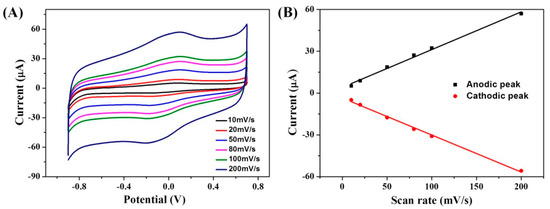 The interface reaction control process of the modified electrode determined the rate in the catalytic process, and was also related to the electron transfer of the interface between the modified electrode and the electrochemical performance of the modified electrode. In this study, the control process of the electrode interface was studied at a different scanning rate with a modified GCE/ERGO-Nafion/AuNPs/Cyt c/Nafion electrode in a 0.2 M PBS (pH = 7.0) buffer solution. Figure 4A shows the CV curves of the GCE/ERGO-Nafion/AuNPs/Cyt c/Nafion electrode at a scan rate of 10, 20, 50, 80, 100, and 200 mV/s in 0.2 M PBS (pH = 7.0), respectively. The peak current increased with the scan rate increasing. Figure 4B displays the dependence between the response current and scan rate. It was found that there was a linear relationship between the peak current of the redox peak and the scan rate at different scan rates from 10 to 200 mV/s. The linear correlation coefficient (R2) between the current value of the oxidation peak and the scan rate was 0.9975, and the current value and scan of the reduction peak. The linear correlation coefficient (R2) of the rate was 0.9985. This result revealed that the electron transfer of ERGO-Nafion/AuNPs/Cyt c/Nafion displayed a surface control rather than a diffusion control process due to the immobilization of Cyt c.