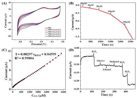 The GCE/ERGO-Nafion/AuNPs/Cyt c/Nafion electrode was verified as a biosensor against the H2O2, and the CVs (Figure 5A) and amperometric responses (Figure 5B) of the GCE/ERGO-Nafion/AuNPs/Cyt c/Nafion electrode to H2O2 were performed. In the CV curves, the reduction peak current at -0.2 V of the biosensor electrode sequentially increased with the increase of H2O2 concentration. The peak current of the oxidation peak of the modified electrode, GCE/ERGO-Nafion/AuNPs/Cyt c/Nafion, had almost no difference in or without the presence of H2O2 in PBS. The catalytic reaction of the modified GCE/ERGO-Nafion/AuNPs/Cyt c/Nafion electrode to H2O2 was mainly the reduction process. The reaction mechanism was as follows [12,35,36]: